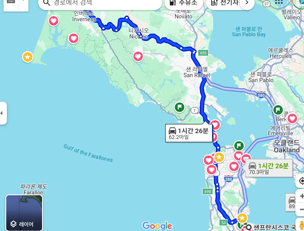 샌프란시스코 공항에서 오늘 숙소인 포인트레예스 인근 Lodge at Marconi 숙소까지 구글맵입니다. 그런데 저는 이 루틴으로 가지 않고, 파란색 옆에 보이는 1번 국도로 갔습니다. (바다길에 가까운 길) 저는 이 길을 강력히 추천합니다. 길은 좀 험했습니다. 산을 오르락내리락 그리고 심지어 난간도 없습니다. 그런데, 바다 위를 달리는 느낌, 상상하시겠습니까? 이런 드라이브는 처음이었습니다. 이 느낌은 1번국도로 북으로 계속 올라가면서 반복되었습니다. 정말 1번국도 + 101번 국도 드라이브 코스는 강추입니다.