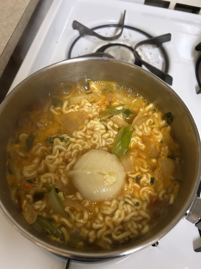 숙소에 도착하자마자 만두라면에 야채를 가미한 너구리!! 상상이 되시죠? 산장에서 너구리를 잡아서 바로 끓인 것같은 신선함. 제 별명중에 너구리 별명이 있는데, 너구리가 너구리를 요리한거죠.