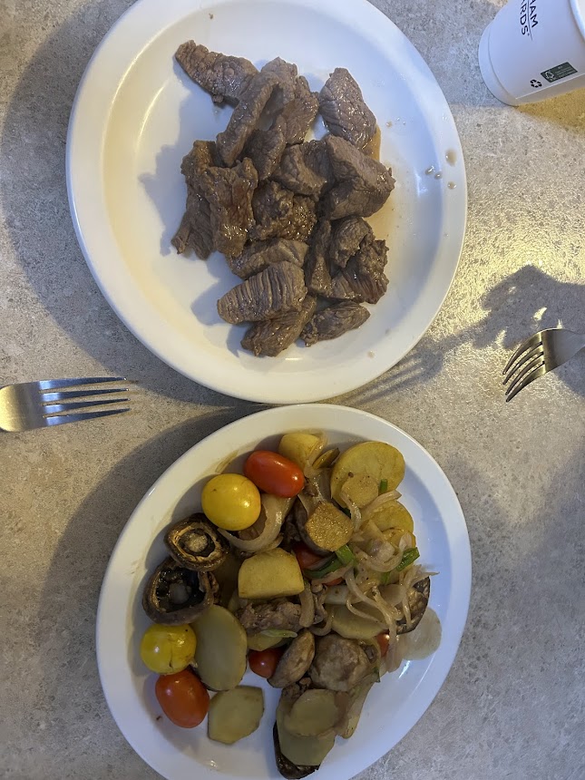 스파후 요리했던 등심구이와 야채버섯구이. 등심은 세이프웨이에서 초이스등급으로 샀고요, 기름이 없어서 레몬즙을 넣고 구웠습니다. 등심의 기름으로 쓰려 했는데 기름이 별로 없더군요. 미국 소고기 인정입니다. 마블링도 없고, 호주 소고기처럼 방목한 고기지만, 질기지가 않았어요. 한국으로 수입되어 오는 소고기만 좀 낮은 등급이라 하더군요. 볶음요리에는 전자렌지용 한국 만두에 들어있던 간장을 넣어 주었습니다.